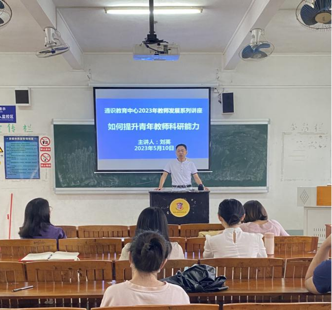 期初至今,通识教育中心积极贯彻落实学校科研强校的方针,动员广大教师们积极投身于科学研究活动,并于2023年5月10日下午在海纳楼召开全体教师会议,主题即科研工作深入有效开展,中心副主任梁健主持并全面传达了学校科研工作会议精神,使大家深层认识了学校有关科研工作的具体部署及有关政策。会议还邀请学校科研处副处长刘英作了《如何提升青年教师科研能力》的讲座,属教师发展系列讲座其一。刘英从高校科研产生的历史渊源、科研能力的重要性、如何提高科研水平等水方面展开,内容详实,逻辑清晰,层次拓展,便于教师们理解学习。特别是关于科研能力提升方面,刘处长从研究方向的选定、积极加入科研团队、如何申报纵向、横向课题三方面给予了清晰明确的指引。最后刘处长为大家解读了学校最新的科研政策,激励大家拿出“直挂云帆济沧海”的勇气,乘风破浪,在科研的道路上砥砺前行。